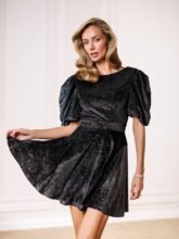 Ši juoda blizgi suknelė suknelė „Puffed Shoulders Mini Blown“ spinduliuoja jaunatviškumu ir žaismingumu. Suknelė yra trumpa, su lengvai platėjančiu sijonu. Viršutinė dalis pasižymi pūstomis rankovėmis ir uždaru priekiu, tačiau nugaroje yra stilinga iškirptė, atidengianti dalį nugaros. Blizgantis audinys suteikia prabangos pojūtį, o aksesuarai, tokie kaip žėrintys auskarai, sidabriniai aukštakulniai ir delninė, puikiai papildo įvaizdį. Tai tobula vakarinė suknelė ypatingoms progoms ar renginiams.